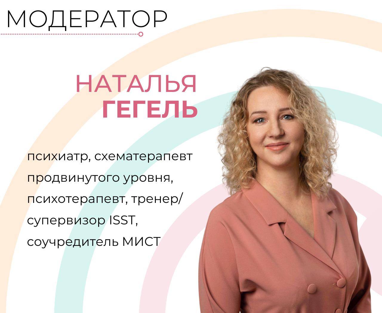 Модератор: Наталья Гегель — психиатр, схема‑терапевт продвинутого уровня, психотерапевт, тренер/супервизор ISST, соучредитель МИСТ.